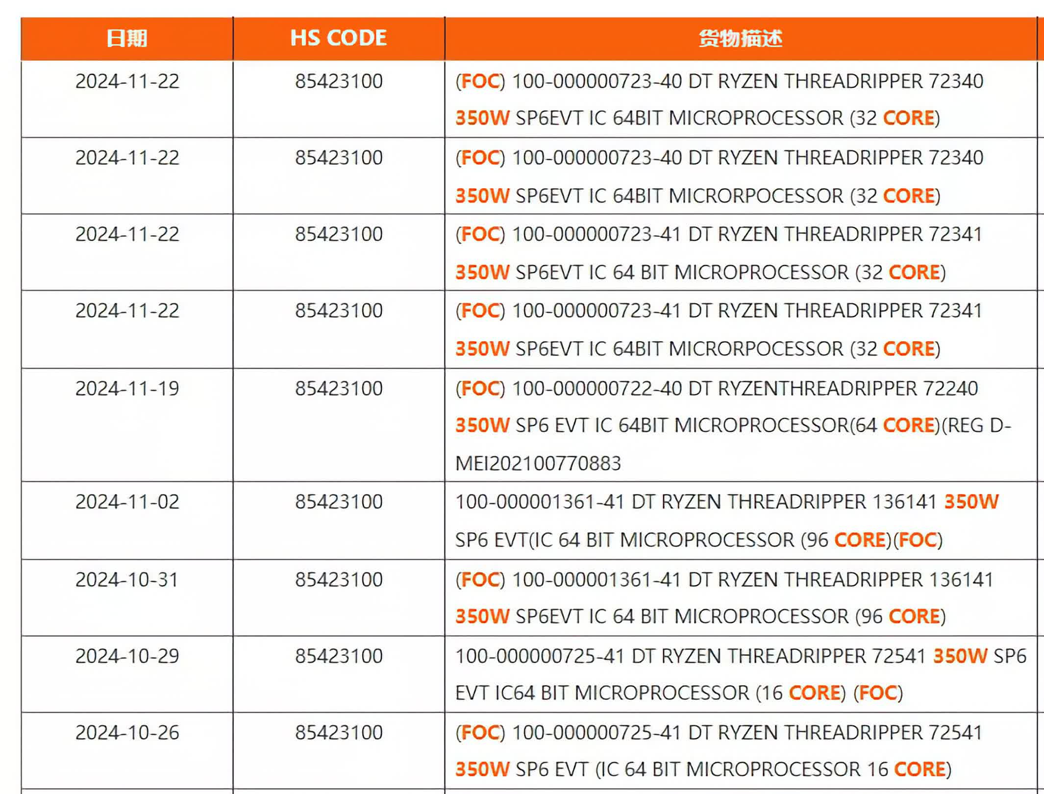 The shipping manifest, sourced from NBD, a logistics company, reveals that AMD is preparing 96-core, 64-core, 32-core, and 16-core variants for the Threadripper 9000 series. Notably, all the listed SKUs share a 350W TDP, which is identical to the "Storm Peak" CPUs they are likely set to replace.