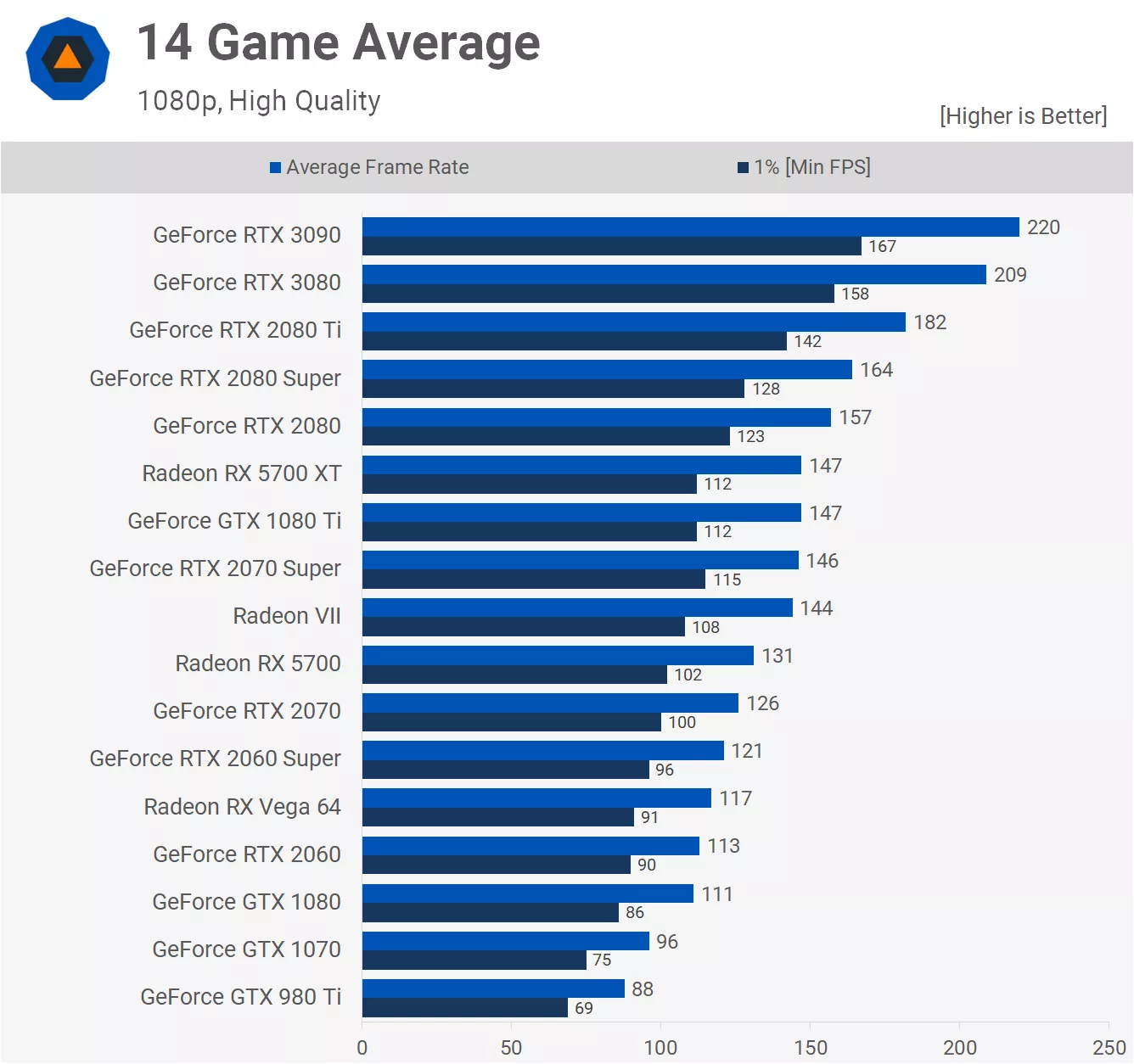 Here's a look at cost per frame, which isn't overly relevant for a product like the GeForce RTX 3090, but since we have the data, why not share it. No surprises here, the RTX 3090 is not a good value proposition for gamers, but it's also amusing to see that despite costing $1500, it's far better value than the RTX 2080 Ti.