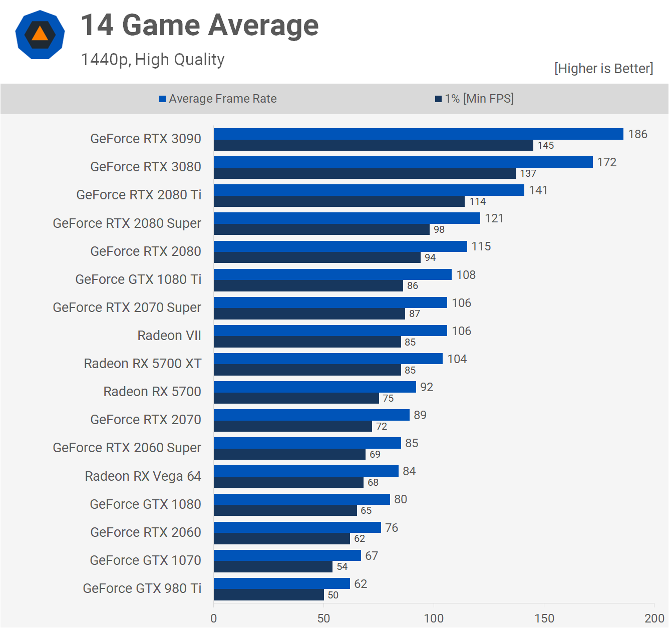 Starting with 1080p performance, we're looking at a modest 5% uplift over the RTX 3080 and a 21% increase over the RTX 2080 Ti, the only two relevant GPUs for this comparison. At 1440p the margin over the RTX 3080 grows to 8% and there's a 32% jump over the 2080 Ti. So spending 114% more on the RTX 3090 is going to be a pretty tough sell for an 8% increase at 1440p gaming, but then who are we kidding. Those with deep enough pockets won't hesitate to snap up that price to performance ratio.