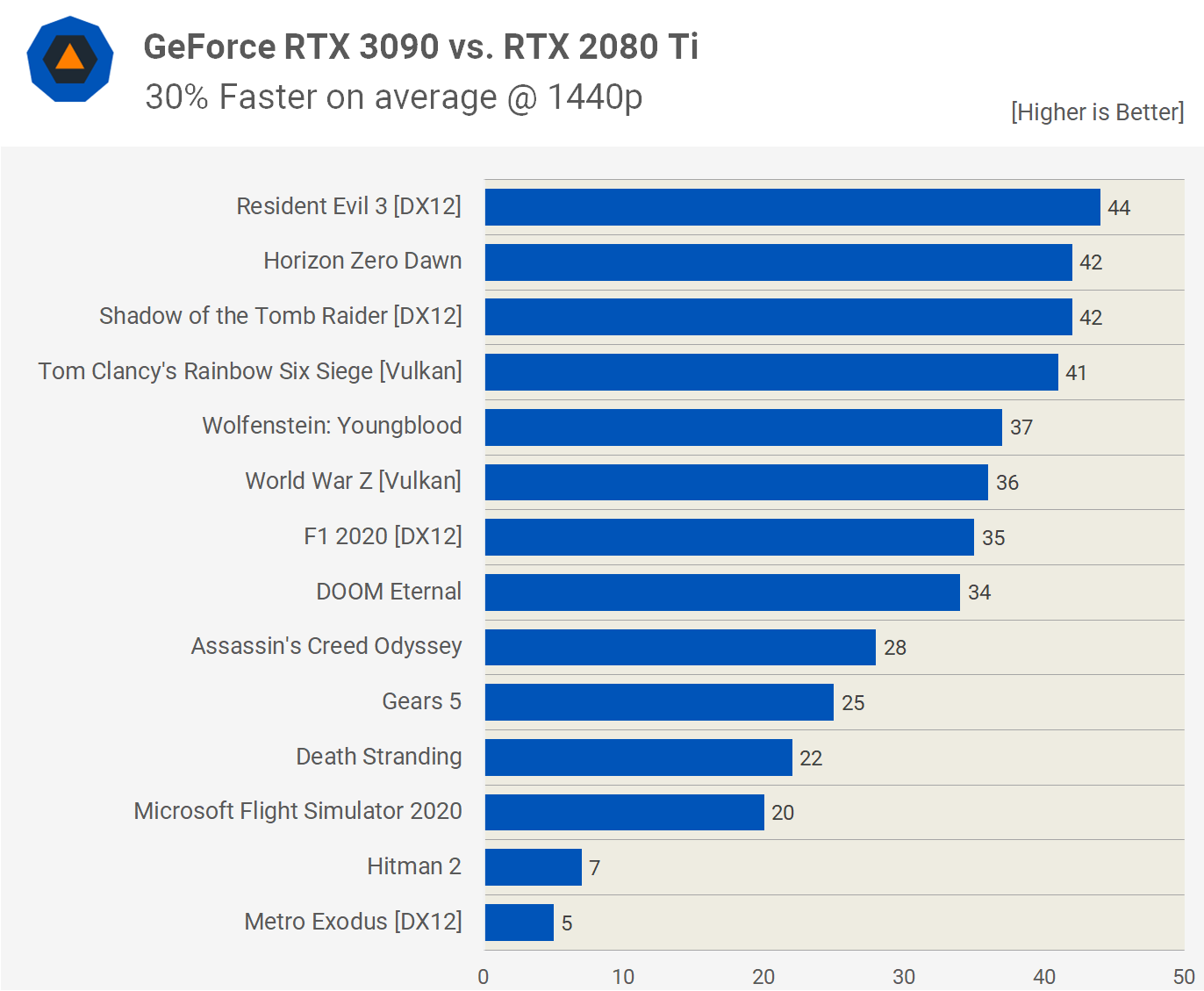 For those hoping to upgrade from a 2080 Ti, the peak gain we observed was a 44% performance improvement in Resident Evil 3. Typically though you are looking at about a 30% performance uplift, which is about what the 2080 Ti offered over the 1080 Ti for a 70% increase in price.