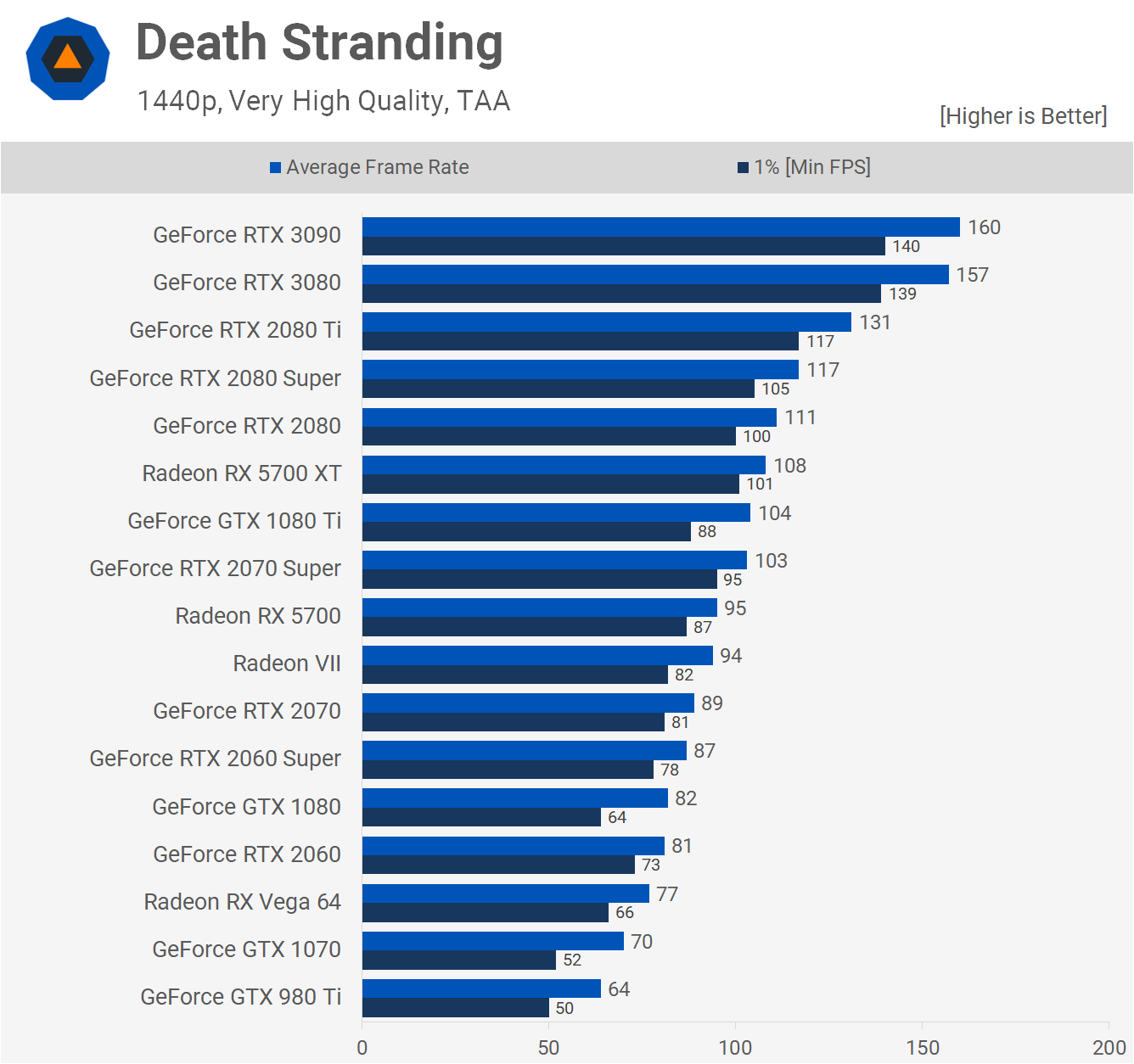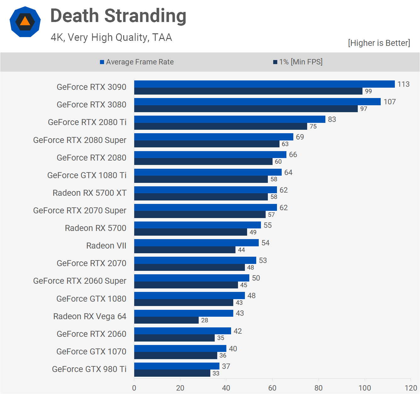 Starting with Death Stranding we see that the 1440p results are very underwhelming, though we could be a little CPU limited here. Even when increasing the resolution to 4K, which sees the GPU become the primary system bottleneck, the RTX 3090 is a mere 6% faster than the 3080, taking the average frame rate from 107 fps to 113 fps. We weren't expecting a ton, but we've got to say this is a discouraging result.