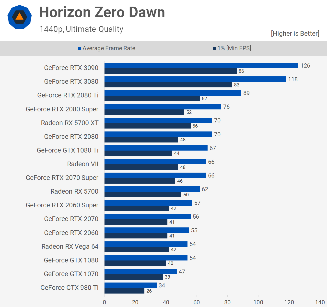 Next up we have Horizon Zero Dawn and we're again looking at weak performance gains at 1440p, just a 7% jump over the RTX 3080...