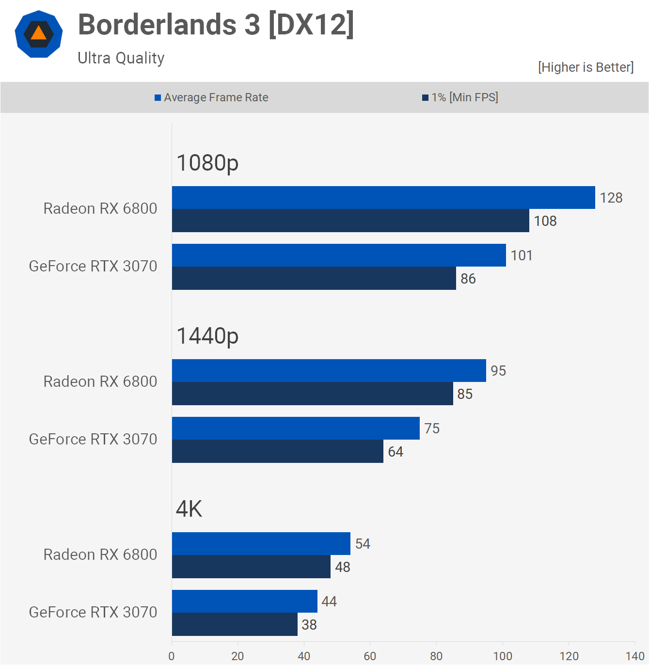 Borderlands 3 shows more impressive margins for the Radeon. Here the RX 6800 beats the 3070 by 27% at 1080p and 1440p, averaging 128 and 95 fps respectively, using the ultra quality preset. At 4K the RX 6800 leads the RTX 3070 by a 23% margin, pushing up to 54 fps on average from 44 fps, so a solid performance uplift there.